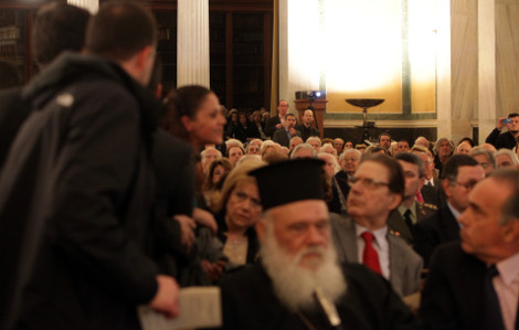 Κατά τη διάρκεια εκδήλωσης για την ελληνική γλώσσα στην Ακαδημία Αθηνών τέσσερις γυναίκες και μία ανήλικη κοπέλα επιτέθηκαν φραστικά στον πρωθυπουργό Αντώνη Σαμαρά και τον πρόεδρο της Δημοκρατίας Κάρολο Παπούλια αποκαλώντας τους προδότες. Ωστόσο αν και οι δύο άντρες ενοχλήθηκαν από το περιστατικό παρέμειναν ψύχραιμοι και δεν φοβήθηκαν σε αντίθεση με τον πρώην υπουργό Βύρωνα Πολύδωρα, ο οποίος φαίνεται να αιφνιδιάστηκε.