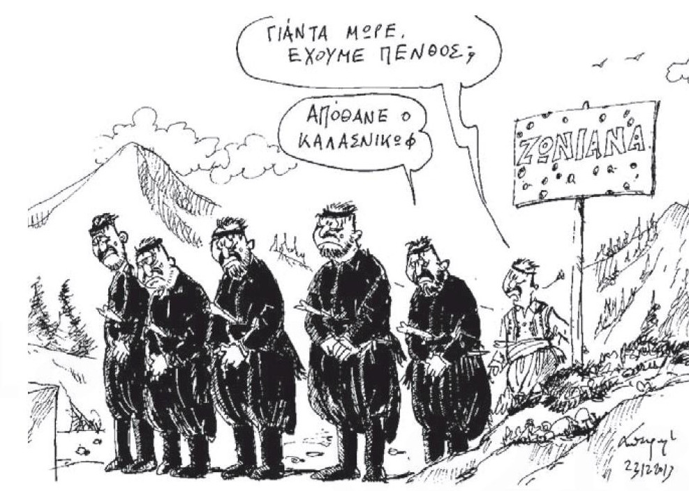 Μαυροντυμένοι, αξύριστοι, βρακοφόροι πενθούν στα Ζωνιανά της Κρήτης στο άκουσμα μιας είδησης που τους βύθισε στη θλίψη. Ολα αυτά συμβαίνουν στο σκίτσο του Ανδρέα Πετρουλάκη στην Καθημερινή με αφορμή μια είδηση θανάτου που έκανε χθες τον γύρο του κόσμου.