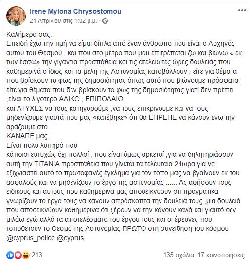 Σάλος επικρατεί στην Κύπρο με την προκλητική ανάρτηση της συζύγου του Αρχηγού της Αστυνομίας, για την υπόθεση του serial killer με τις επτά δολοφονίες.Με ανάρτησή της στο Facebook, η γυναίκα του Αρχηγού της Αστυνομίας Ζαχαρία Χρυσοστόμου, Ειρήνη Μυλωνά-Χρυσοστόμου, σχολίασε υπερασπιζόμενη τον σύζυγό της, τις κριτικές που δέχεται από πολίτες, για την αδυναμία του ιδίου, να εμποδίσει τις δολοφονίες του serial killer.