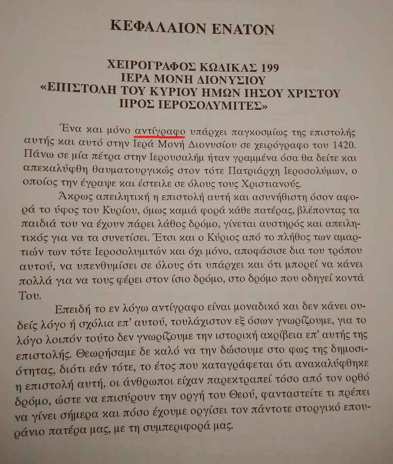 Οι περίφημες επιστολές του Ιησού, που πωλούσε τηλεοπτικώς, με ιδιαίτερο μπρίο, ο νέος ευρωβουλευτές και επικεφαλής της Ελληνικής Λύσης, Κυριάκος Βελόπουλος, είναι χειρόγραφα που έχουν συνταχθεί τον 15ο αιώνα μετά Χριστόν!Είναι ένα κείμενο, που όπως έχουν αναφέρει αναλυτικά τα Ellinika Hoaxes, που ασχολήθηκαν με την υπόθεση Κυριάκου Βελόπουλου, απεκαλύφθησαν θαυματουργικώς στον τότε Πατριάρχη Ιεροσολύμων. Αυτός είδε πάνω σε μία πέτρα το κείμενο του Ιησού, το κατέγραψε και το έστειλε σε όλους του Χριστιανούς. Το χειρόγραφο είναι γραμμένο στα Ελληνικά και φυλάσσεται στην Μονή Διονυσίου στο Αγιον Ορος.
