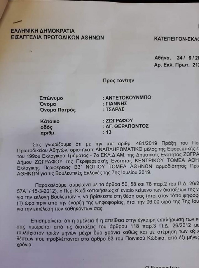 Το έγγραφο που καλεί τον Αντετοκούνμπο να πάει ως αναπληρωματικό μέλος σε εφορευτική επιτροπή