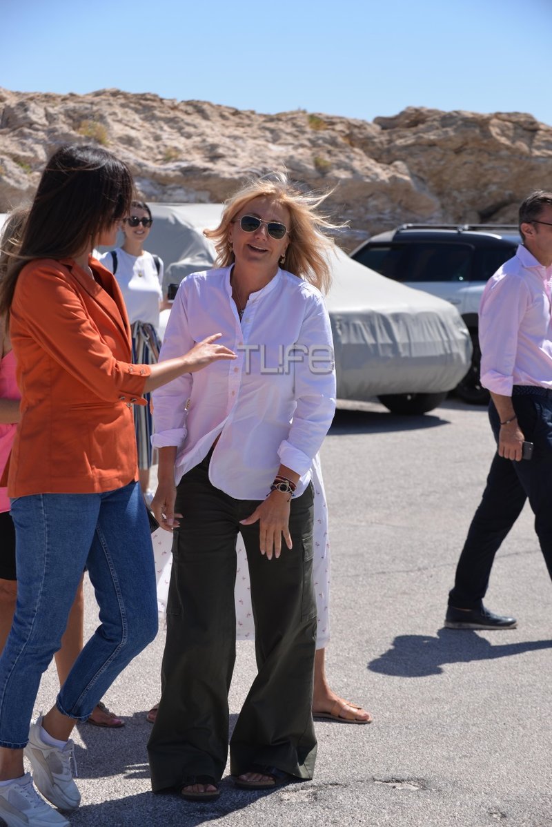 Η σύζυγος του Κυριάκου Μητσοτάκη έφθασε στο χώρο της εκκίνησης με chic casual look, λευκό πουκάμισο και χακί παντελόνι.