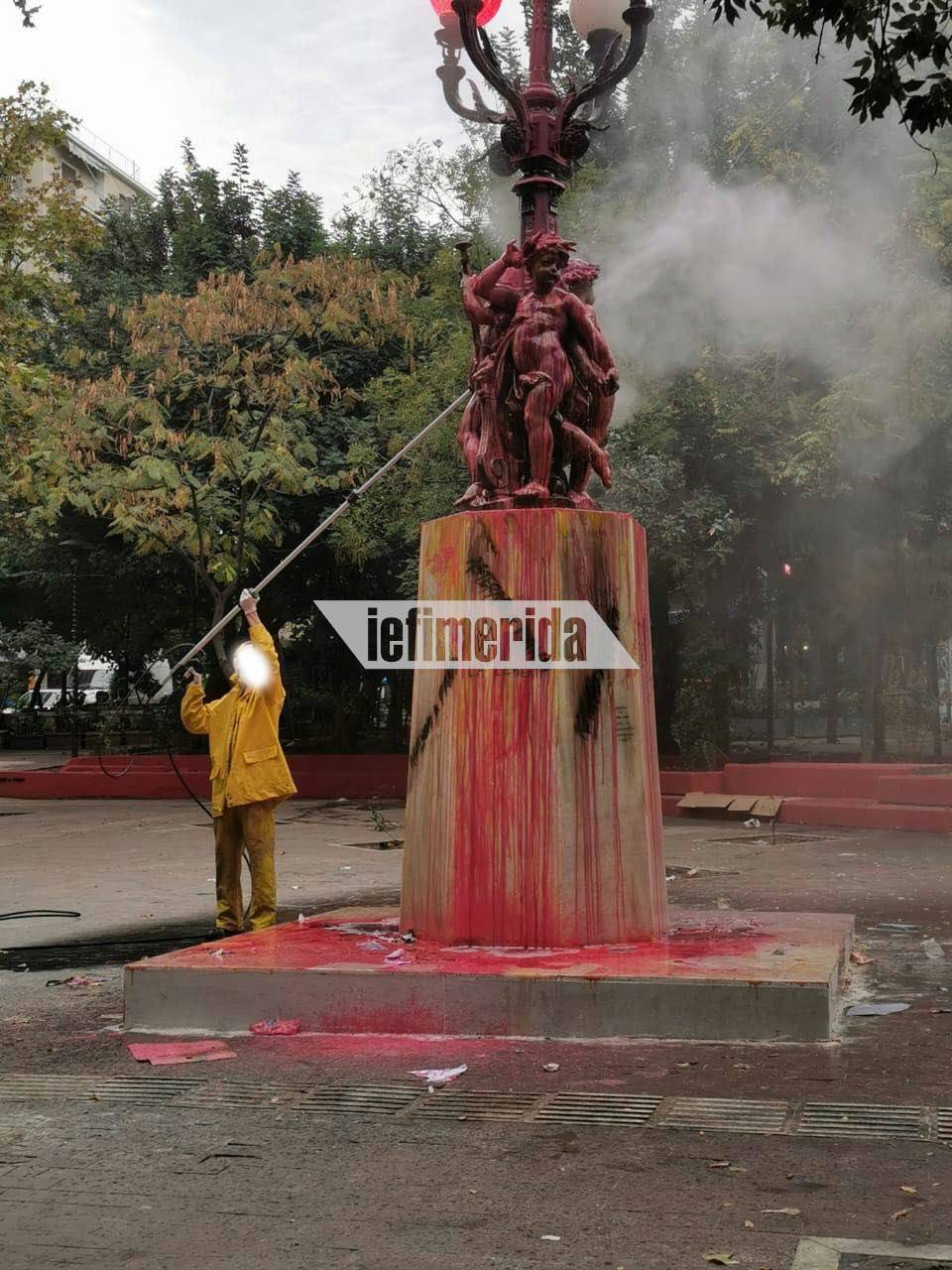 Όπως βλέπουμε και στις φωτογραφίες, το άγαλμα είχε καλυφθεί από κόκκινη μπογιά.