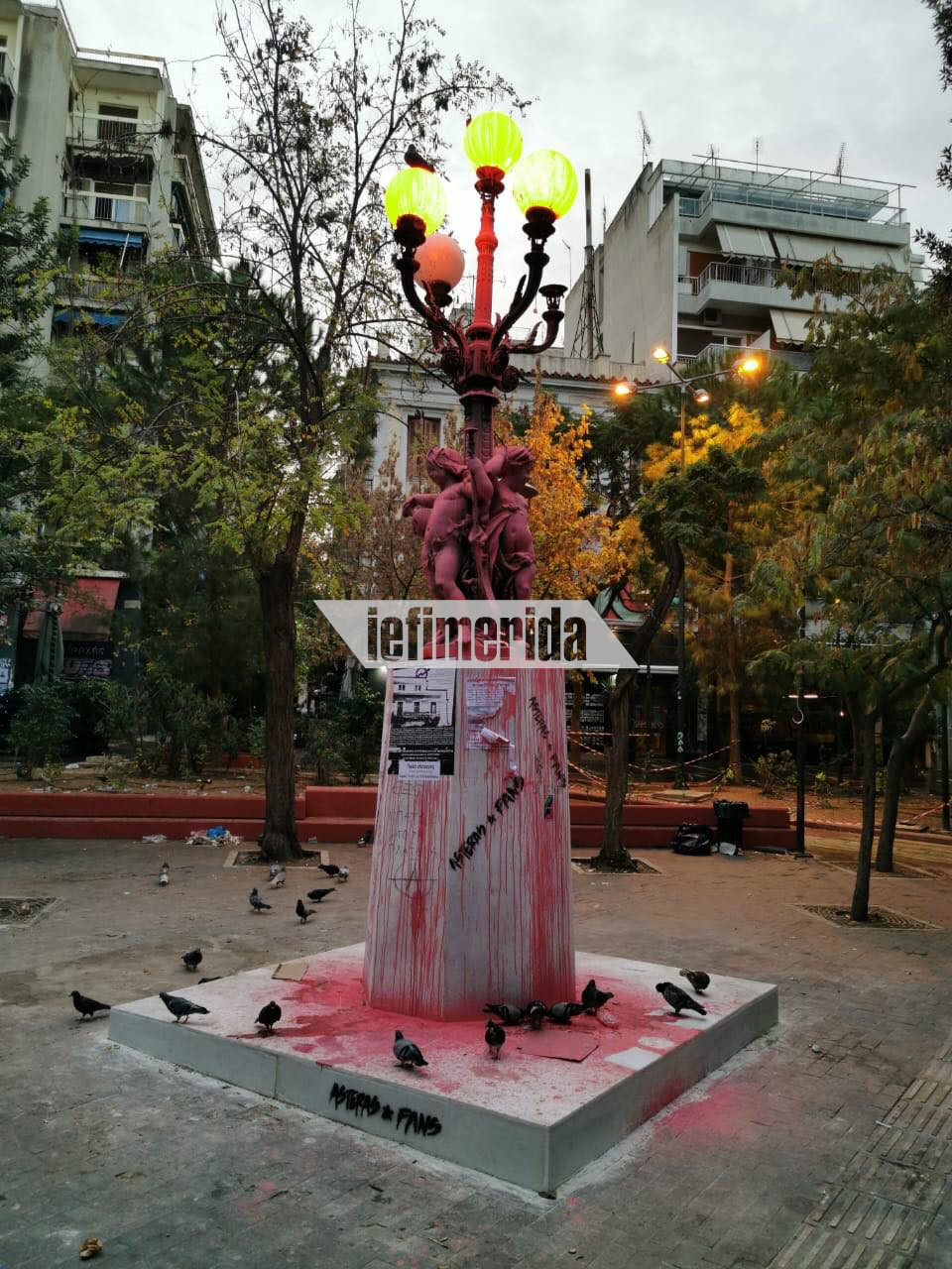 Άγνωστοι πέταξαν μπογιές και έγραψαν συνθήματα στο άγαλμα που βρίσκεται στο κέντρο της πλατείας και στη συνέχεια εξαφανίστηκαν.