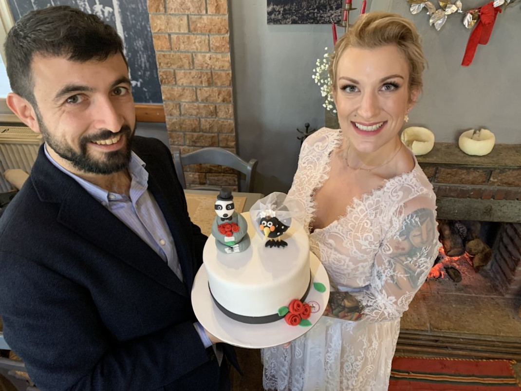 Συγκεκριμένα ανέφερε: «Η τούρτα! O Σταύρος μου είναι κτηνίατρος. Στην αρχή της γνωριμίας μας, ναζιάρικα τον ρώτησα τι ζώο θα ήμουν και μου απάντησε «φραγκόκοτα» για να με πειράξει. Το πήρα κι εγώ στα σοβαρά και έμεινε. Αυτός ήταν από την αρχή ο «βραδύποδάς» μου: ήρεμος, υπομονετικός, με αγάπη για τον… ύπνο, ήρθε και κούμπωσε τέλεια πάνω στο δικό μου σβέλτο, ανυπόμονο και ενθουσιώδες του χαρακτήρα μου. Τα φαινομενικά αταίριαστα ζωάκια έγιναν το πιο ταιριαστό ζευγάρι. Ο sloth και η φραγκόκοτα έγιναν τατουάζ, κουκλάκια και inside jokes στην παρέα μας. Ε δεν γινόταν να μην γίνουν και γαμήλια τούρτα! Την ανέλαβε η φίλη μου Νίκη Καβαδάτου στη Λάρισα»!