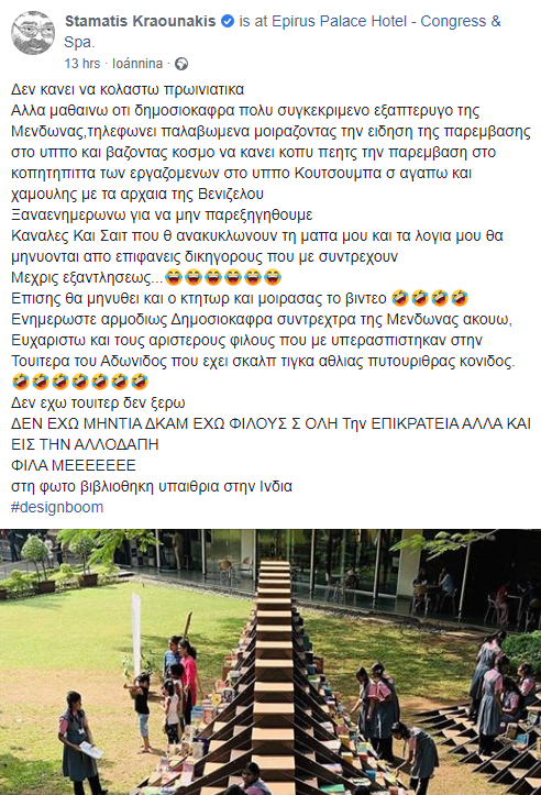 Με νεότερες αναρτήσεις του στο Facebook ο Σταμάτης Κραουνάκης απειλεί με μηνύσεις τα ΜΜΕ που ανακυκλώνουν τα λόγια και το πρόσωπό του, αλλά και τον άνθρωπο που τράβηξε το βίντεο.