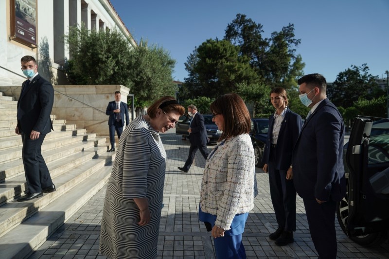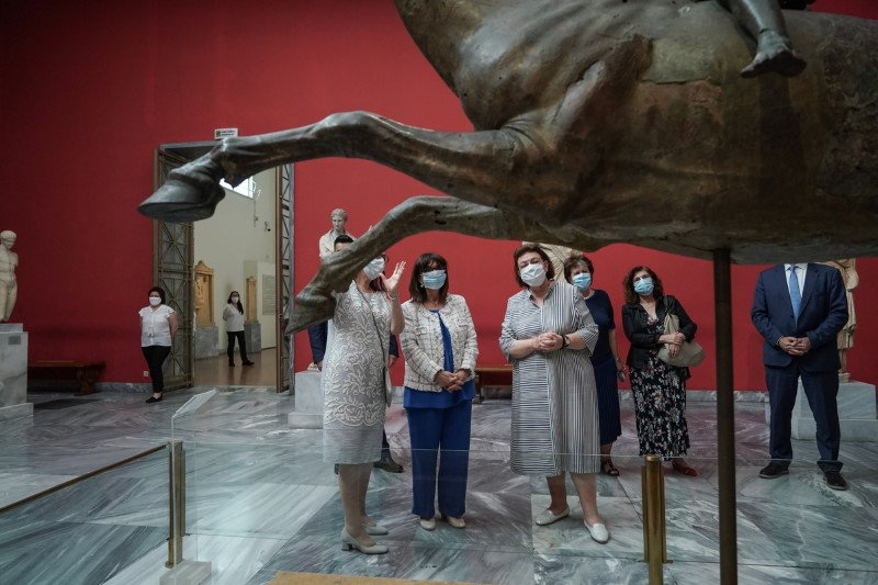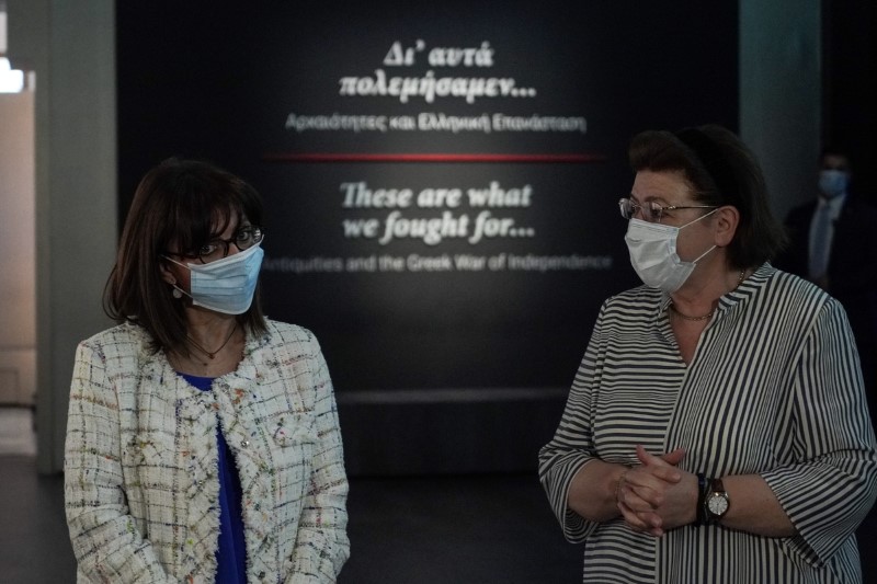 Η κα Σακελλαροπούλου ξεναγήθηκε από την υπουργό Πολιτισμού Λίνα Μενδώνη στην έκθεση «Δι' αυτά πολεμήσαμεν».