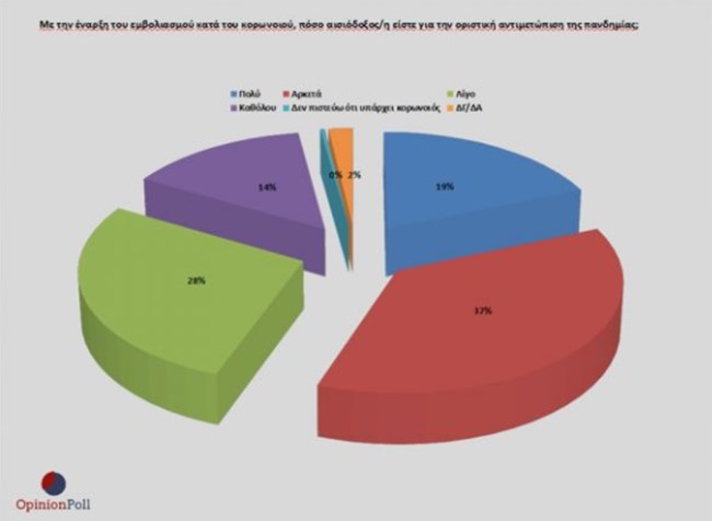 Σε μια δύσκολη, κομβική στιγμή αντιμετώπισης της πανδημίας εμφανίζεται πάντως μία τόνωση της αισιοδοξίας λόγω της ύπαρξης πια εμβολίου, αφού το 56% δηλώνει αισιόδοξο για την οριστική αντιμετώπιση του κορονοιού. Αυτό δηλώνει το 74.3% της Ν.Δ και το 71.9% του ΚΙΝΑΛ που είναι τα πιο αισιόδοξα κομματικά ακροατήρια, το 47.6% του ΣΥΡΙΖΑ, το 51.3% του Κ.Κ.Ε, το 44.4% του ΜΕΡΑ 25 και το 28.5% της ΕΛΛΗΝΙΚΗΣ ΛΥΣΗΣ στην οποία εμφανίζεται το χαμηλότερο ποσοστό αισιοδοξίας. Σημειώνουμε ότι τον Οκτώβριο και τον Νοέμβριο τα ποσοστά αισιοδοξίας ήταν αντίστοιχα 51% και 45% αντίστοιχα.