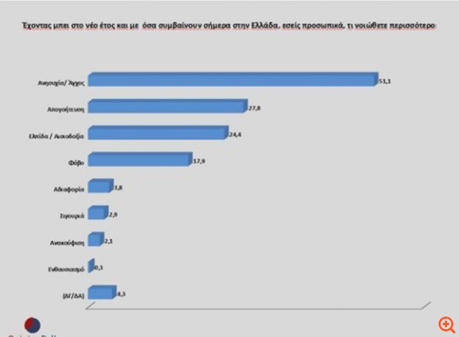 Είναι χαρακτηριστικό, ότι το 51.1% των ερωτώμενων δηλώνει ότι αισθάνεται ανησυχία και άγχος, το 27.8% απογοήτευση, το 22.4% ελπίδα και αισιοδοξία, ενώ σιγουριά και ανακούφιση αισθάνεται μόλις το 2.9% και 2.1% αντίστοιχα.Τα ποσοστά αυτά δεν πρέπει να ξενίζουν. Η Ελληνική κοινωνία μετά από δέκα χρόνια Μνημονίων, βρέθηκε σε μια δίνη που κλείνει ένα χρόνο από τα προβλήματα που δημιούργησε η πανδημία και τα συνεπακόλουθα της υγειονομικά, οικονομικά, ψυχολογικά.