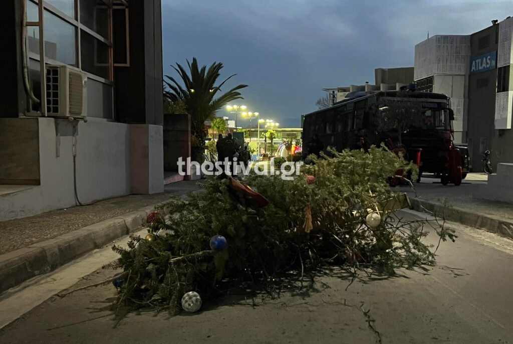 Μια από τις μολότοφ έπεσε σε χριστουγεννιάτικο δέντρο, που είχε τοποθετήσει η ΔΕΘ μπροστά στην πύλη εμπορίου.