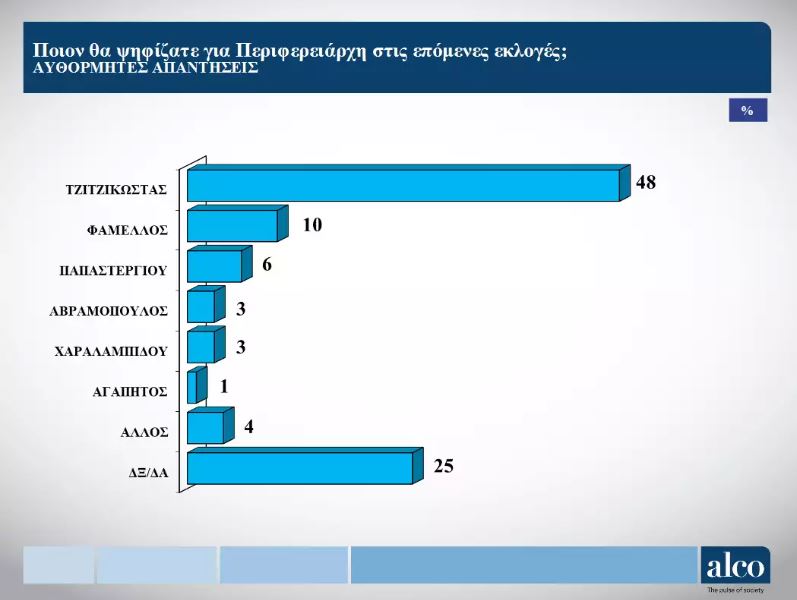 Ο Απόστολος Τζιτζικώστας είναι πρώτος με 48% και ακολουθεί ο Σωκράτης Φάμελλος με 10%.