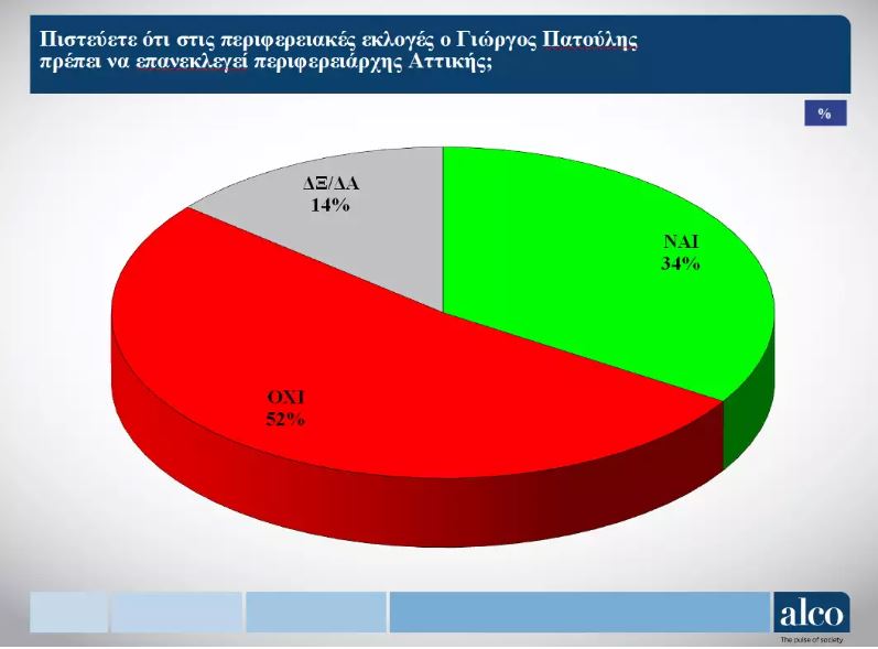 Για το αν πρέπει να επανεκλεγεί ο Γιώργος Πατούλης 52% απαντά όχι και 34% ναι.