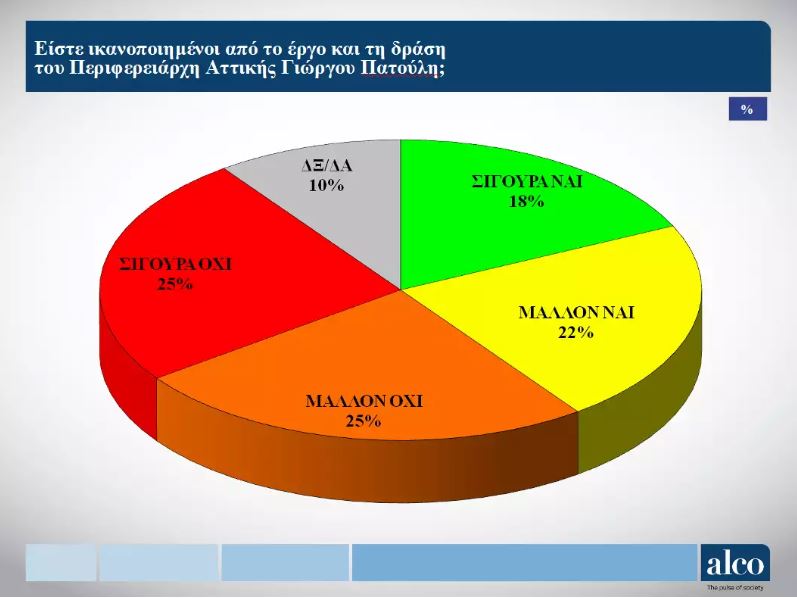 Όσον αφορά στο ποσοστό ικανοποίησης από το έργο Πατούλη, οι πολίτες που είναι λιγότερο ικανοποιημένοι υπερτερούν όσων δηλώνουν ότι το βλέπουν θετικά.