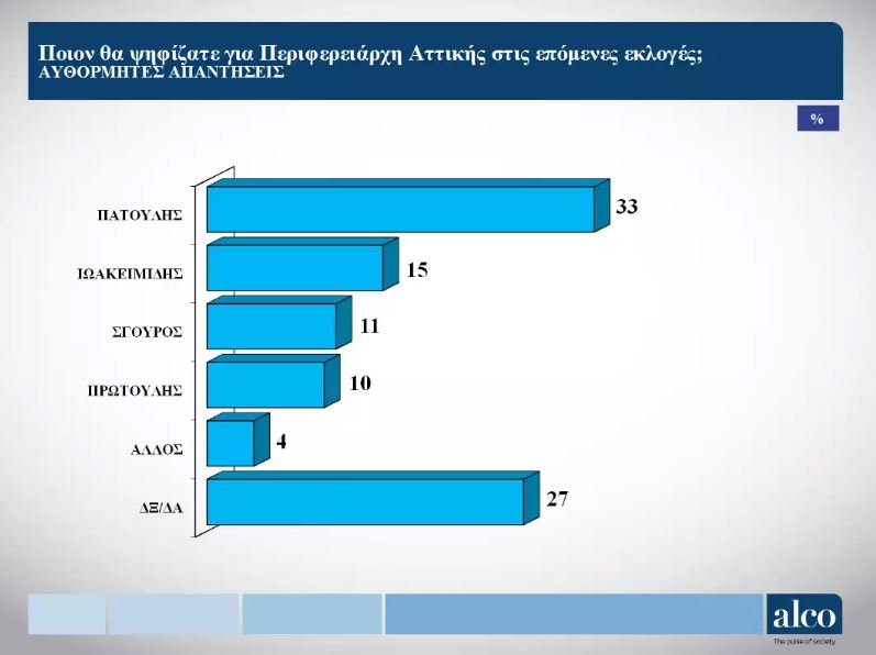 Στην Περιφέρεια Αττικής η δημοσκόπηση της Alco Αττικής έγινε από τις 8 έως τις 14 Ιουνίου και στο ερώτημα ποιον θα ψηφίζατε για περιφερειάρχη στις επόμενες εκλογές το 33% απαντά τον Γιώργο Πατούλη, ενώ στη μάχη για την διεκδίκηση της Περιφέρειας μπαίνει ο Γιώργος Ιωακειμίδης ο οποίος πρόσφατα ανακοίνωσε την υποψηφιότητά του. Η δημοσκόπηση του δίνει 15%.