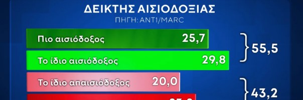Σε ό,τι αφορά στον δείκτη αισιοδοξίας, το 55,5% των ερωτηθέντων δηλώνει πιο αισιόδοξο και το ίδιο αισιόδοξο, ενώ το 43,2% εμφανίζεται το ίδιο απαισιόδοξο και πιο απαισιόδοξο.