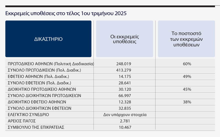 Σύμφωνα με τα στοιχεία της CEPEJ, η εικόνα των εκκρεμών υποθέσεων κατά το 1ο τρίμηνο του 2025 δεν είναι και τόσο θετική. Οι εκκρεμείς υποθέσεις στο Πρωτοδικείο Αθηνών (πολιτικές) είναι 248.019 και στο σύνολο των πρωτοδικείων της χώρας ο αριθμός ανέρχεται σε 413.279.