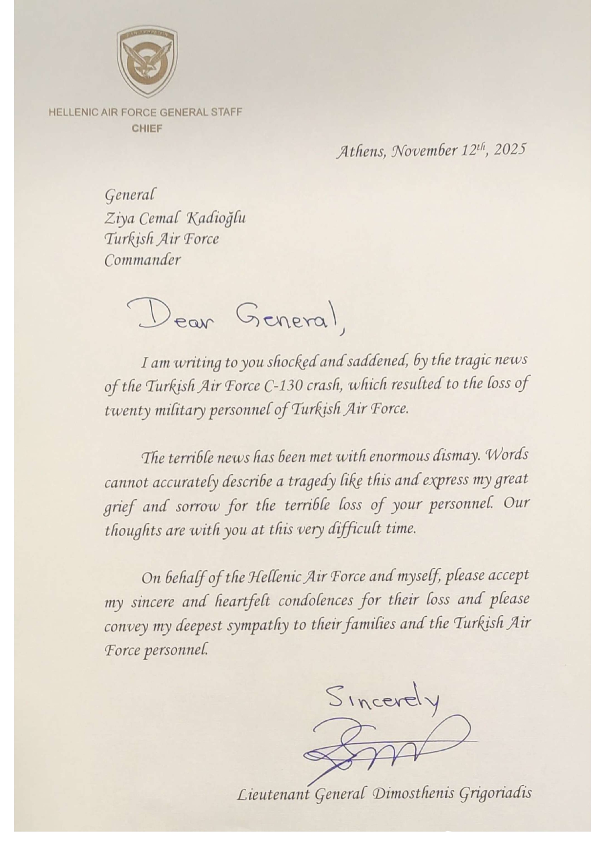 Η ανάρτηση κατέβηκε γρήγορα από την Ελλάδα και λίγο μετά δημοσιεύθηκε επιστολή του Αρχηγού ΓΕΑ, Αντιπτέραρχου Δημοσθένη Γρηγοριάδη, ο οποίος φέρεται να απέστειλε υπογεγραμμένη συλλυπητήρια επιστολή στον Τούρκο ομόλογό του για το δυστύχημα με το C-130, που συνετρίβη στη Γεωργία, αφότου απογειώθηκε από το Αζερμπαϊτζάν.