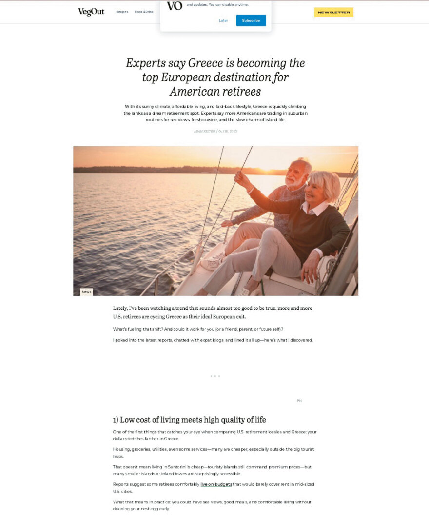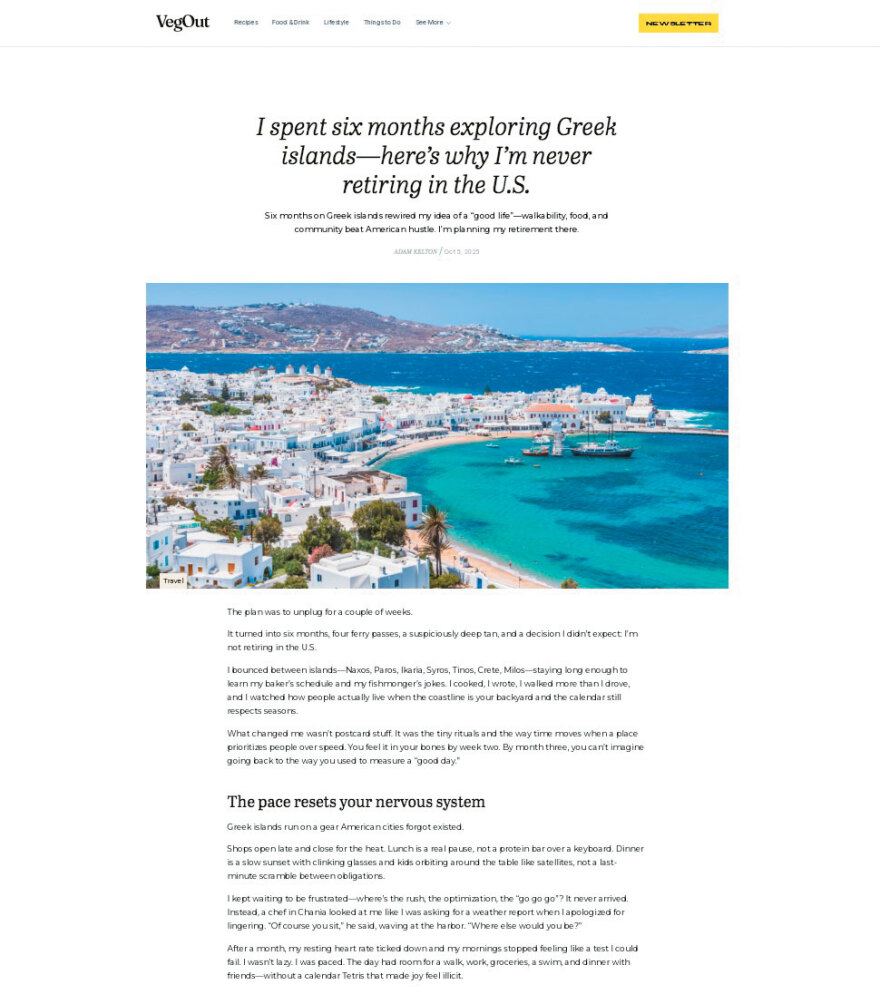 «Οι Αμερικανοί με ευκολία αλλάζουν τη Φλόριντα με την Ελλάδα»: αυτός είναι ο τίτλος ενός άλλου μεγάλου άρθρου-ύμνου για τη χώρα μας, του Ανταμ Κέλτον, στο ψηφιακό περιοδικό VegOut που ειδικεύεται σε προτάσεις για έναν υγιεινό τρόπο ζωής, διαμονής και διατροφής. Ο ίδιος έγραψε τρία συνεχόμενα άρθρα μέσα στο τελευταίο δίμηνο έχοντας, όπως αναφέρει, ξοδέψει έξι μήνες σε διάφορα ελληνικά νησιά ώστε να αποκτήσει προσωπική εμπειρία για την ποιότητα ζωής των κατοίκων σε αυτά.