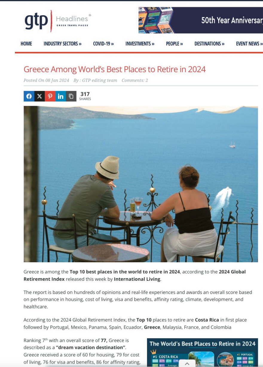 Για τους Αμερικανούς ειδικούς αφενός της αγοράς του real estate και αφετέρου των συνταξιοδοτικών θεμάτων, η Ελλάδα δεν έχει ακόμα κατακτήσει την κορυφή των προτιμήσεων των συμπατριωτών τους συνταξιούχων για μόνιμη εγκατάσταση, αλλά βρίσκεται πλέον σε εντυπωσιακή ανοδική τροχιά, που εφόσον συνεχιστεί τίποτα δεν μπορεί να αποκλειστεί.