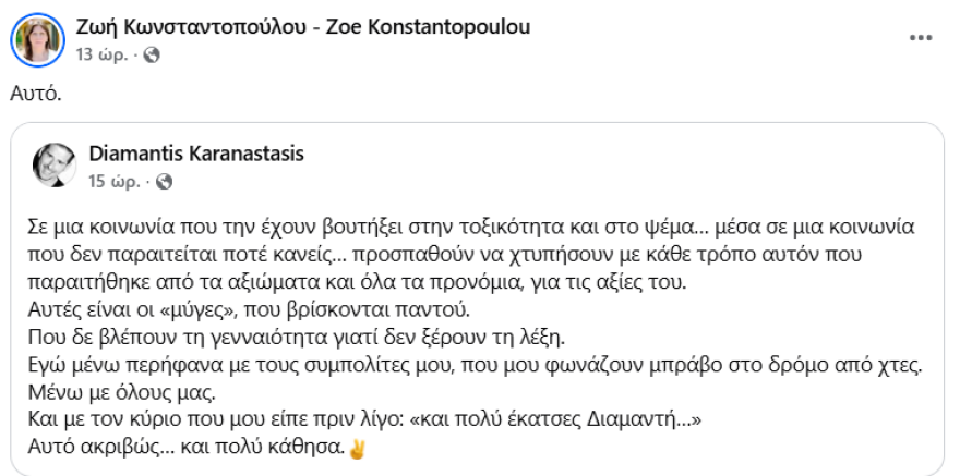 «Αυτό» ήταν το μοναδικό σχόλιο της Ζωής Κωνσταντοπούλου στην τελευταία χρονικά ανάρτηση του Διαμαντή Καραναστάση, με την πρόεδρο της Πλεύσης Ελευθερίας στη συνέχεια να κάνει και μια νέα δήλωση στο περιστύλιο της Βουλής.