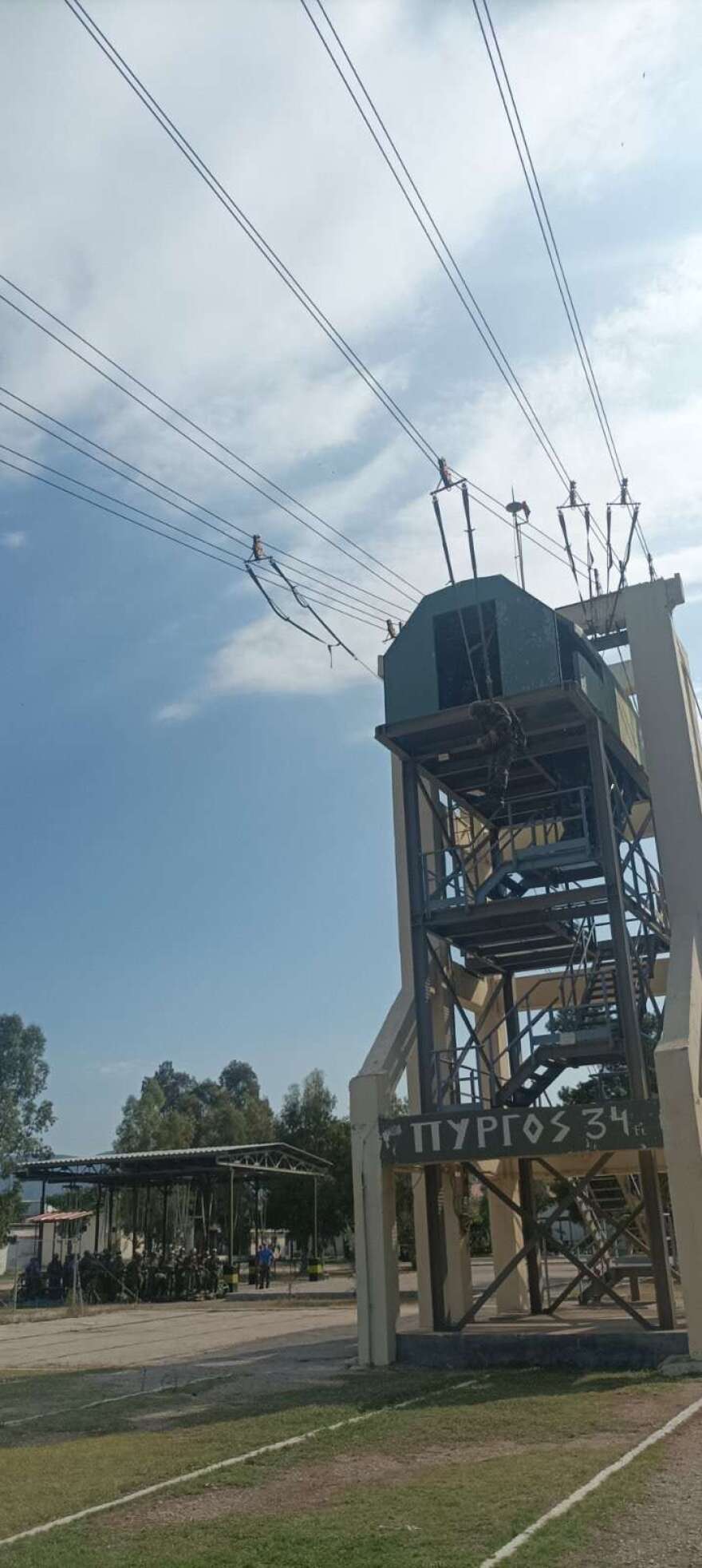 Ο πύργος αποτελεί την κυριότερη εγκατάσταση στη Σχολή Αλεξιπτωτιστών, καθώς συμβάλει καθοριστικά στον εθισμό τού εκπαιδευόμενου σε κρίσιμες διδικασίες, όπως η εγκατάλειψη τού αεροσκάφους κατά την εκτέλεση άλματος. Έχει ύψος 34 πόδια (περίπου 11 μέτρα). Σε αυτό το ύψος, όπως έχει αποδειχθεί επιστημονικά, επέρχεται κορύφωση τών συμπτωμάτων ιλίγγου σε ένα φυσιολογικό άτομο. Όποιος δεν έχει πρόβλημα όταν αντικρύζει το έδαφος από αυτό το ύψος, θεωρείται κατάλληλος για πτώσεις στο κενό από οποιοδήποτε ύψος.