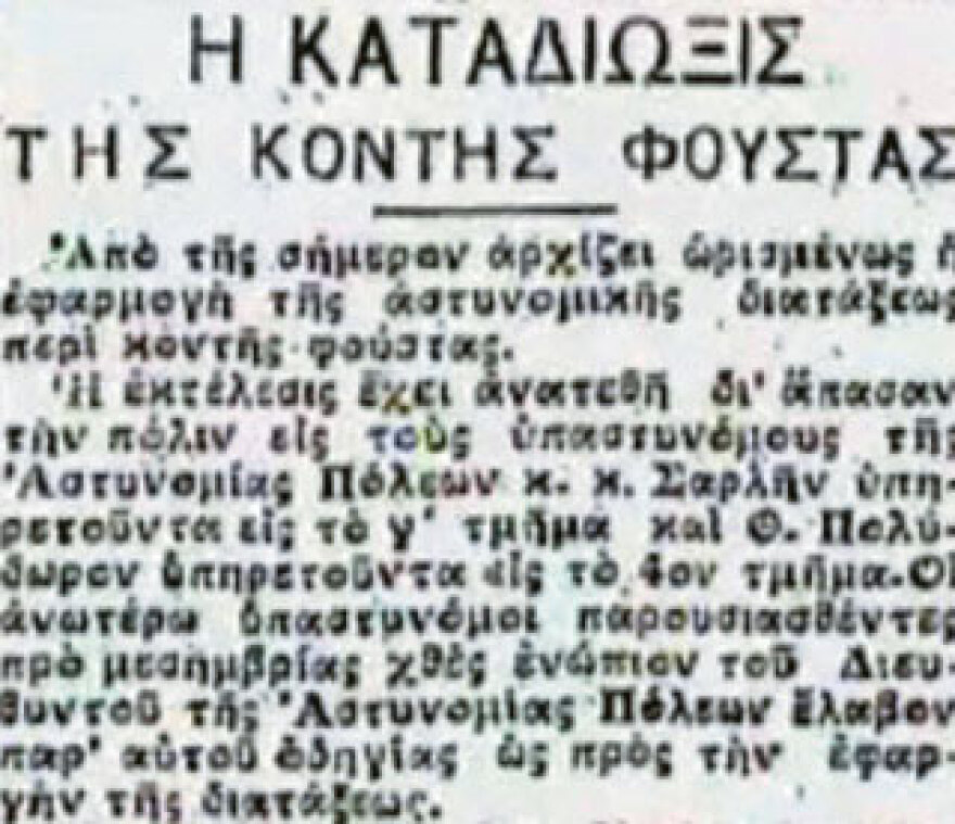 «Κατόπιν διαταγής του Προέδρου της Κυβερνήσεως, καταρτίζεται και υποβάλλεται εις το υπουργείον Εσωτερικών προς έγκρισιν αστυνομική διάταξις δι’ ης απαγορεύονται αι κονταί φούσται των γυναικών. Το κατώτατον άκρον της φούστας δέον να απέχη από του εδάφους 30 εκατοστά του μέτρου. Εις τον περιορισμόν τούτον υπάγονται άπασαι αι γυναίκες από του 12ου έτους και άνω. Αι παραβάτιδες θα παραπέμπωνται εις το επ’ αυτοφώρω πταισματοδικείον, συνυπεύθυνοι θα είναι και οι γονείς αυτών. Η εφαρμογή θα αρχίση από 15 Δεκεμβρίου».