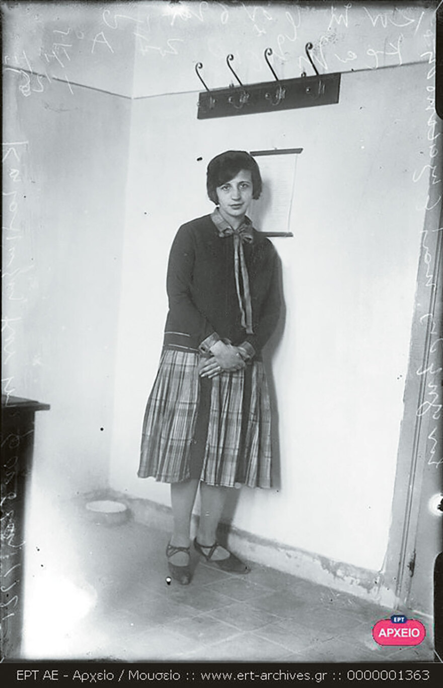 Σύμφωνα με το αρχείο της ΕΡΤ, η φωτογραφία του Πέτρου Πουλίδη εικονίζει τη Χριστίνα Βογιατζή που συνελήφθη επειδή φορούσε κοντή φούστα.