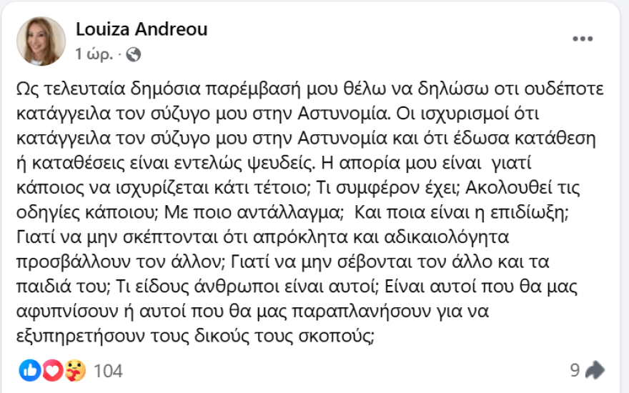 Μέρες μετά την έντονη συζήτηση στα Μέσα Κοινωνικής Δικτύωσης η Λουΐζα Ανδρέου - Φαίδωνος, με ανάρτηση της στο Facebook, διέψευσε τους ισχυρισμούς, κάνοντας λόγο για «συντονισμένη επίθεση» με πολιτική στόχευση, σημειώνοντας ότι με τον σύζυγό της «ζει αρμονικά» εδώ και χρόνια, ζητώντας να μείνουν «τα πολιτικά παιγνίδια» μακριά από την οικογένειά της.