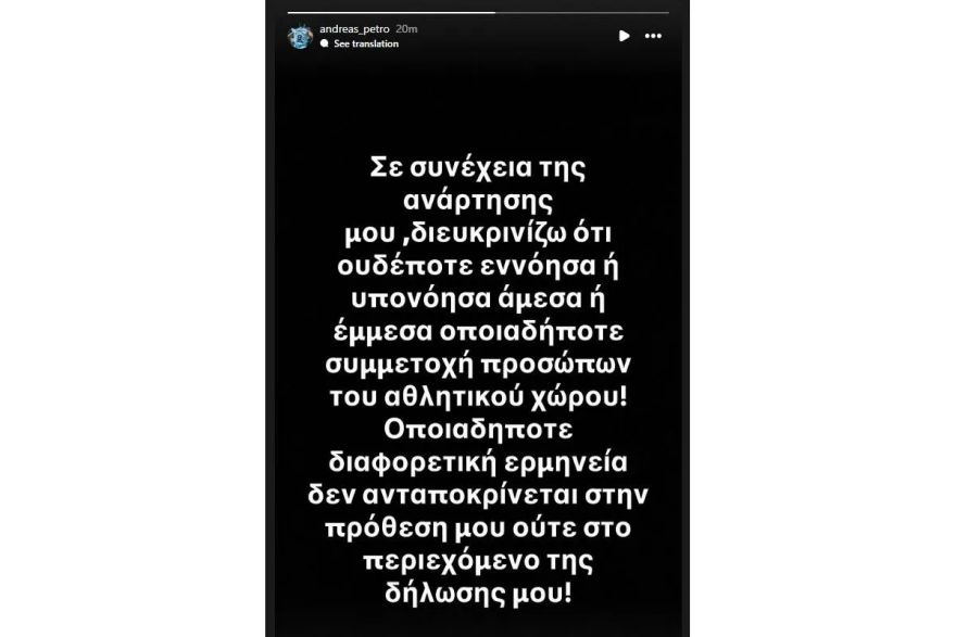 Το αρχικό story και η απόσυρσή τουΜετά το τέλος της αναμέτρησης στο κλειστό της Καλλιθέας Ρόδου για τη 16η αγωνιστική της Stoiximan GBL, ο Ανδρέας Πετρόπουλος ανήρτησε story στο Instagram στο οποίο ανέφερε: