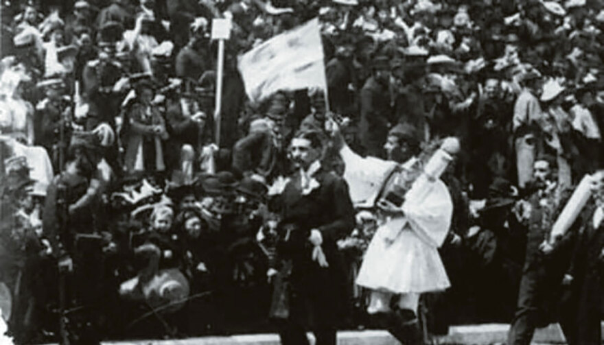 Ο Σπύρος Λούης κάνει τον γύρο του θριάμβου μετά την απονομή για τη νίκη του στον Μαραθώνιο