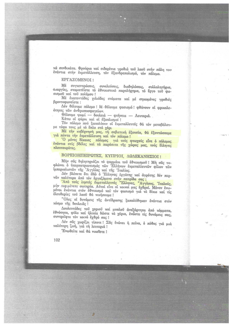 «Η συνεργασία με την εθνική μειονότητα των Κομιτατζήδων οι οποίοι εργάζονται για την απόσχιση της Μακεδονίας πρέπει να γίνει από κοινού. Η στήριξη και ενδυνάμωση αυτών των εθνικοεπαναστατικών οργανώσεων και η αναγνώριση της αυτοδιάθεσης και του δικαιώματος απόσχισης, θα κάνει δυνατόν το ΚΚΕ να αποκτήσει την εμπιστοσύνη των Βουλγάρων ώστε να συνεργαστούν στην ερχόμενη Παγκόσμια Επανάσταση. Γι’ αυτόν τον λόγο το ΚΚΕ πολεμά την Ελληνική μεγάλη ιδέα. Το ΚΚΕ απαιτεί επίσης γι’ αυτόν τον λόγο την απελευθέρωση των Δωδεκανήσων από την Ιταλία. Πολεμά όμως την ενσωμάτωση της περιοχής αυτής στην Ελλάδα, διότι τα Δωδεκάνησα θα μπορέσουν να βρουν την ευτυχία μόνο μέσα σε μια Σοβιετική Δημοκρατία».