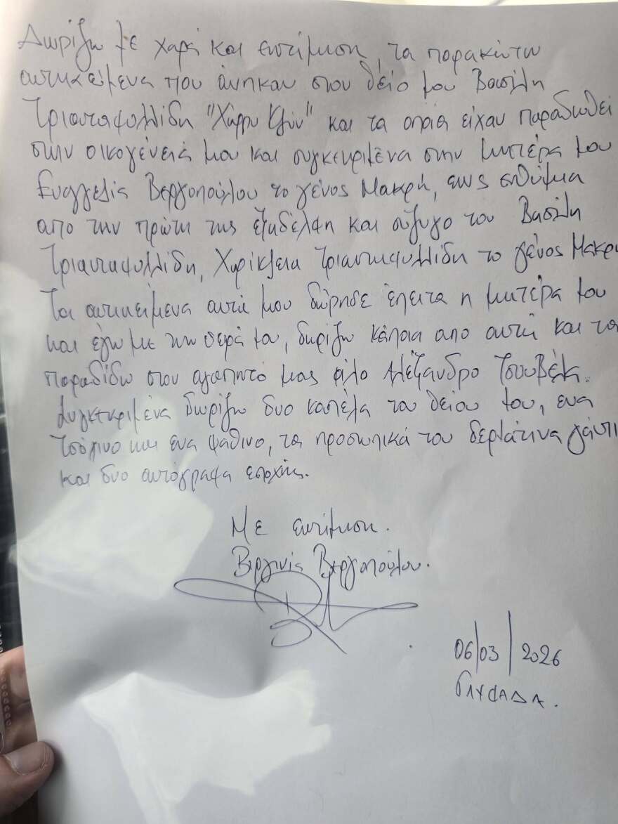 Στο χειρόγραφο σημείωμα αναγράφεται: «Δωρίζω με χαρά και εκτίμηση τα παρακάτω αντικείμενα που ανήκαν στον θείο μου Βασίλη Τριανταφυλλίδη “Χάρρυ Κλυν” και τα οποία είχαν παραδοθεί στην οικογένειά μου και συγκεκριμένα στη μητέρα μου Ευαγγελία Βεργοπούλου, το γένος Μακρή, ως ενθύμιο από την πρώτη της ξαδέλφη και σύζυγο του Βασίλη Τριανταφυλλίδη, Χαρίκλεια Τριανταφυλλίδη το γένος Μακρή. Τα αντικείμενα αυτά μου δώρισε έπειτα η μητέρα μου και εγώ με τη σειρά μου, δωρίζω κάποια από αυτά και τα παραδίδω στον αγαπητό μας φίλο Αλέξανδρο Τσουβέλα. Συγκεκριμένα περιέχουν δύο καπέλα του θείου του, ένα τσόχινο και ένα ψάθινο, τα προσωπικά του δερμάτινα γάντια και δύο αυτόγραφα εποχής. Με εκτίμηση, Βύρων Βεργοπούλου».